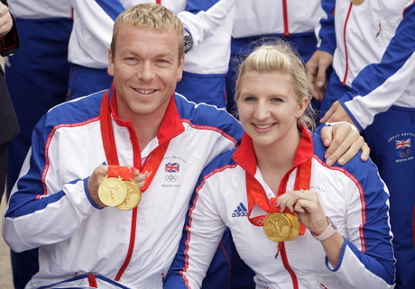 | British Olympic team gold medal winners, 19-year-old swimmer Rebbeca Adlington (R), a double gold medallist and Chris Hoy who won three golds in track cycling, pose for photographers as they arrive back in the UK at Londons Heathrow airport on August 25, 2008. Britain's collection of 19 gold medals lifted it to fourth in the medals table and raised expectations of home success at the 2012 Olympics in London.[Agencies] |