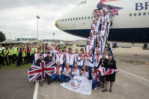 | The British Olympic team poses on August 25, 2008 after returning back to the United Kingdom at London's Heathrow airport. Britain's most successful Olympic team for 100 years arrived home after winning 47 medals in Beijing but team bosses warned that the coaches behind the medal haul could be poached by other nations. Britain's collection of 19 gold medals lifted it to fourth in the medals table and raised expectations of home success at the 2012 Olympics in London. [Agencies] |