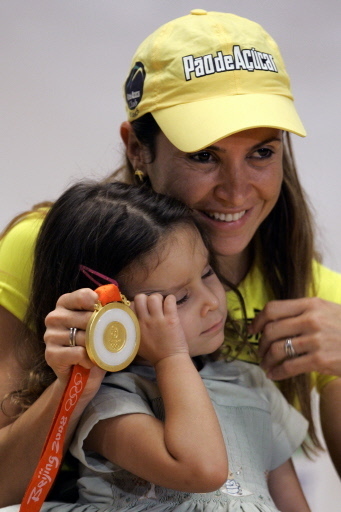 | Olympic long jump gold medallist Brazilian Maurren Higa Maggi (R), shows her medal next to her daughter Sophia during a press conference upon her arrival from the Beijing Olympic Games, in Sao Paulo, Brazil, on August 26, 2008. Maggi became the first Brazilian female athlete to win an olympic gold medal in an individual competition. [Agencies] |