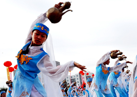 Local residents perform an ethnic dance during the Beijing Olympic torch relay in Wuzhong, Ningxia Hui Autonomous Region, June 30, 2008. [Xinhua]