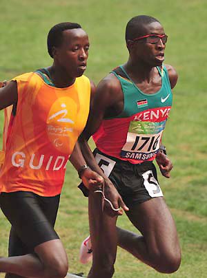 Kenya's Samwel Mushai Kimani (R) competes with the guide during the first round competition of the men's 800M T12 at the National Stadium,also known as the Bird's Nest, at the Beijing 2008 Paralympic Games in Beijing, China, Sept. 8, 2008. [Xinhua]