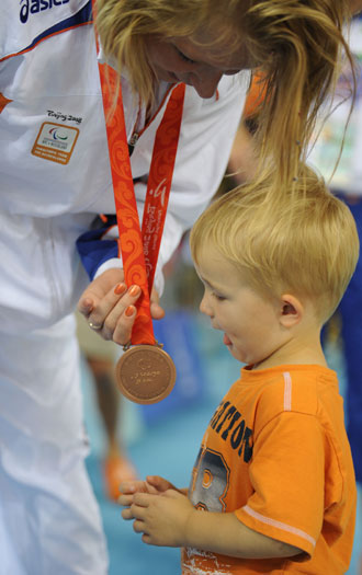 A sitting volleyball player of the Netherlands shares the victory with her little son after the medal ceremony, September 14, 2008. The Netherlands beats Slovenia to win the bronze in women’s sitting volleyball competition.[Xinhua]