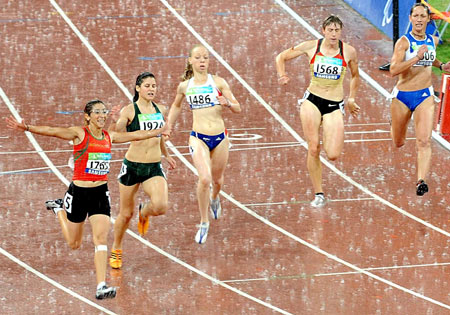 Sanaa Benhama of Morocco (L) celebrates after crossing the finish line to win the gold medal with a new world record of 12.28 in the women's athletics 100M T13 finals at the Beijing 2008 Paralympic Games September 16, 2008. Heavy rain fell in Beijing at dusk one day before the Paralympics end on Wednesday. [Agencies]
