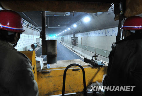 12月24日,兩名建設者正在武漢長江隧道內作業。被譽為“萬里長江第一隧”的武漢長江隧道將于12月28日試通車。武漢長江隧道位于武漢長江大橋和長江二橋之間,全長3.6公里,雙線4車道。該工程于2004年11月破土動工,是我國第一條開建、最先貫通的長江公路隧道。(新華社記者杜華舉/攝)