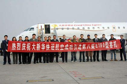 2008年,大新華快運共引進15架E系列客機,包括8架ERJ145和7架E190客機,為春運提供了充足的運力儲備。而這架新飛機的引進又及時填補了春運客流高峰帶來的運力短缺狀況,為旅客的順利出行帶來更多便利。今年,大新華快運將繼續以每月一架的頻率引進E190客機,其中部分新客機將提供商務艙服務,更好地提升旅客的乘機舒適度。此外,大新華快運還將擇機引進一部分ERJ145客機,并計劃新設立2-3個運營基地和分公司,拓展更大范圍航線網絡,方便更多旅客出行。