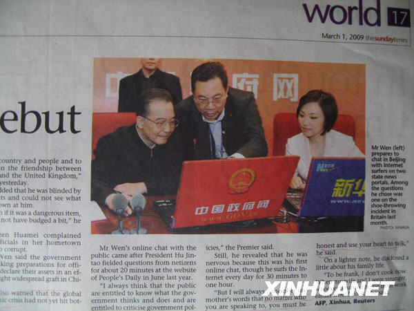 這是3月1日新加坡《海峽時報》對溫家寶總理與網民線上交流的報道。當天,新加坡最大的英文報紙《海峽時報》將新華社、法新社及路透社有關溫家寶總理與網民交流的報道進行了綜合,并配發了相關圖片。新華社記者 張永興攝